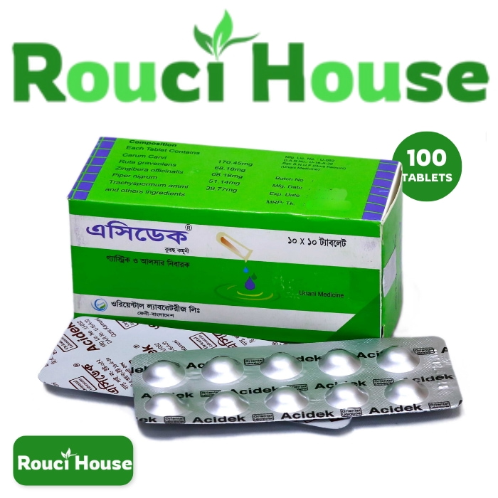 Acidek ট্যাবলেট একটি প্রাকৃতিক ইউনানি ওষুধ যা পেটের সমস্যা যেমন গ্যাস্ট্রিক, পেপটিক আলসার, অম্বল, কোষ্ঠকাঠিন্য এবং হজমজনিত অস্বস্তির জন্য কার্যকর। এটি শরীরের এসিডের ভারসাম্য রক্ষা করে আরাম দেয় ও পেটের ব্যথা হ্রাস করে।